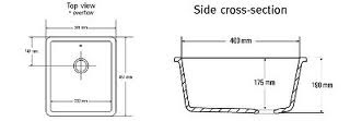 Fregadero Corian. Para integrar en una encimera de Corian sin juntas o en encimera de otro material bajo encimera. Dimensiones exteriores 381x451x190 Dimesnsiones interiores 330x400x175